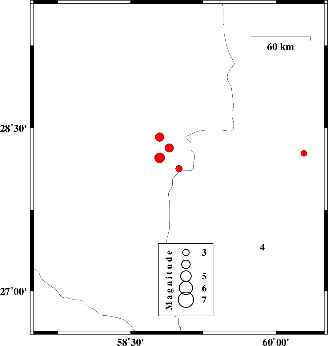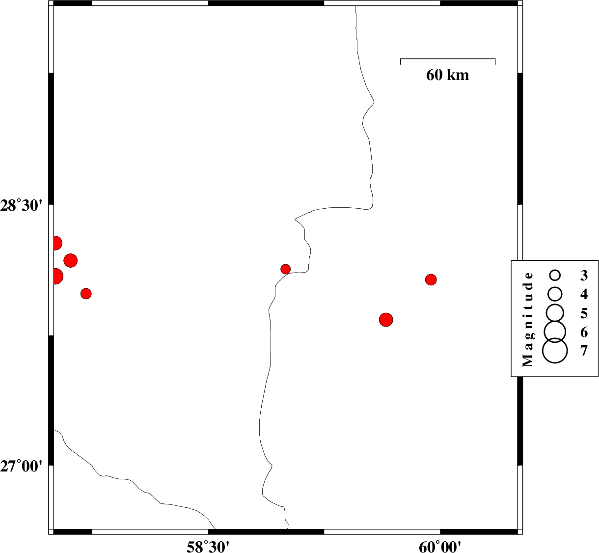 | 2011/07/10 | 19:04:47.5 | 23:34:47.5 | 27.84 | 59.65 | 16 | ML4 | Sistan va Baloochestan Province, 125 km North-West of Iranshahr |