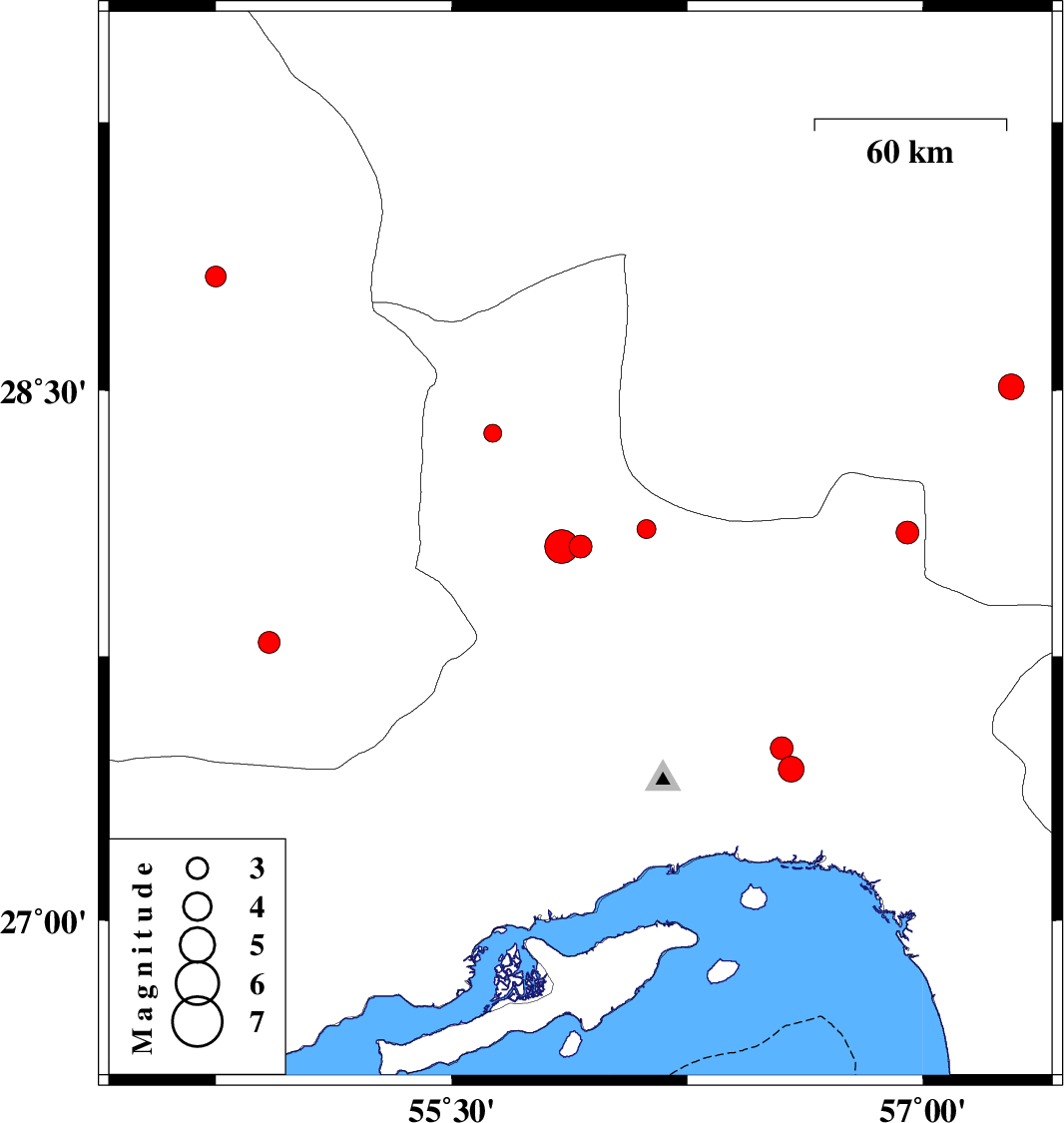 | 2011/08/20 | 04:14:07.7 | 08:44:07.7 | 28.06 | 55.91 | 14 | ML3.2 | Hormozgan Province, 27 km South of Hajiabad | ||
