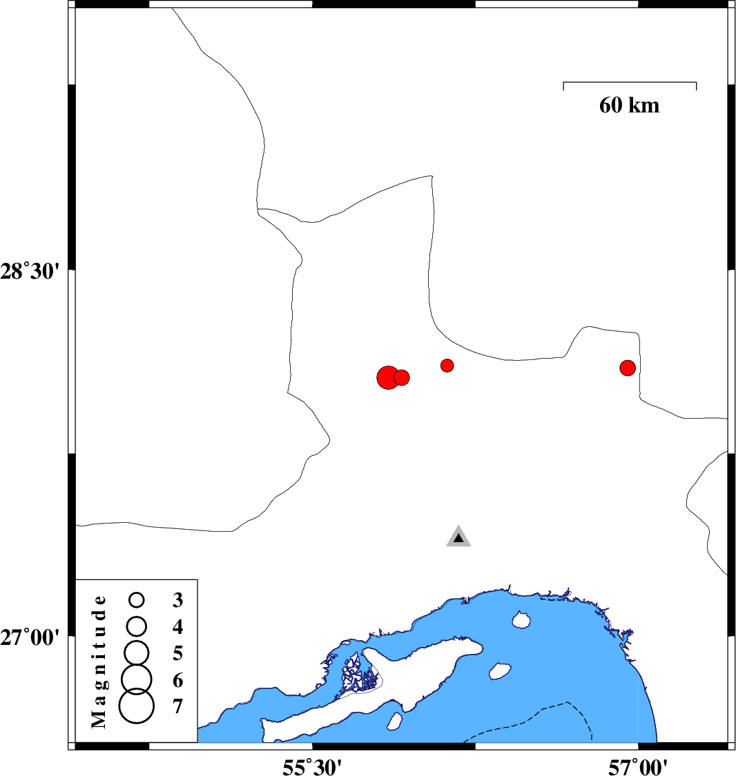 | 2011/08/13 | 06:09:10.5 | 10:39:10.5 | 28.1 | 56.95 | 40 | ML3.2 | Hormozgan Province, 75 km North-West of Kahnuj |