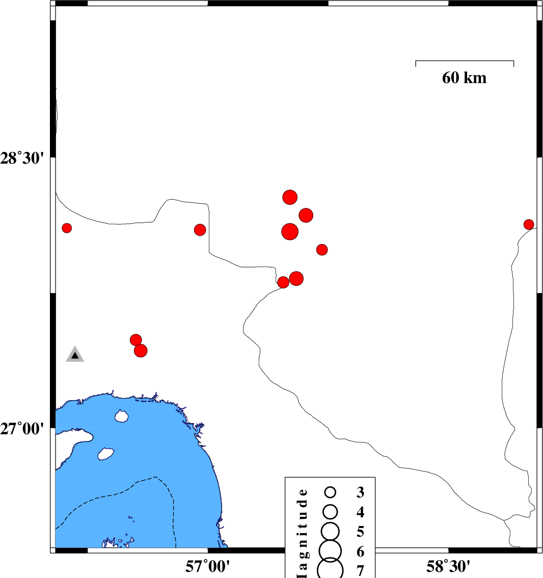 | 2011/07/29 | 13:42:27.8 | 18:12:27.8 | 28.28 | 57.51 | 14 | ML4.1 | Kerman Province, 41 km North-West of Kahnuj | ||