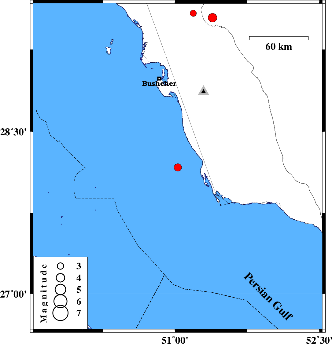 | 2011/08/27 | 01:49:19.7 | 06:19:19.7 | 29.58 | 51.19 | 14 | ML2.9 | Bushehr Province, 35 km North of Borazjan |