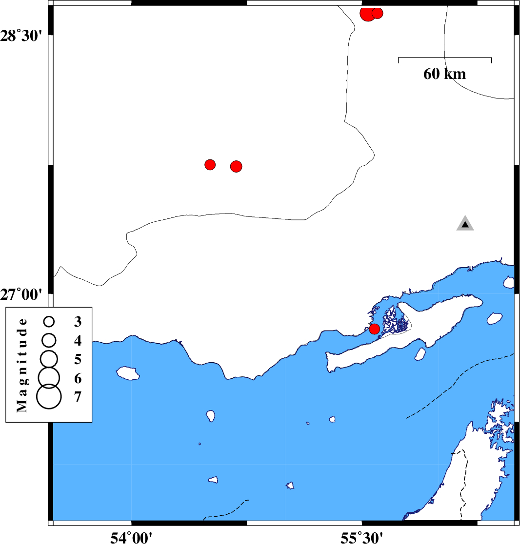 | 2011/08/27 | 15:02:06.2 | 19:32:06.2 | 28.23 | 55.86 | 6 | ML3.4 | Hormozgan Province, 10 km Hajiabad | ||
