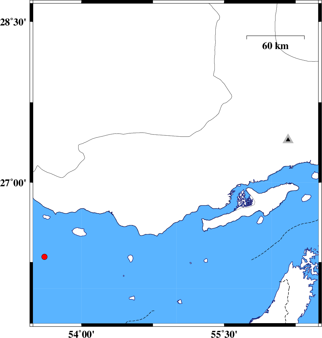 | 2011/08/20 | 22:40:29.1 | 03:10:29.1 | 26.22 | 55.89 | 33 | ML3.1 | Persian Gulf, 90 km South-West of Qeshm | ||