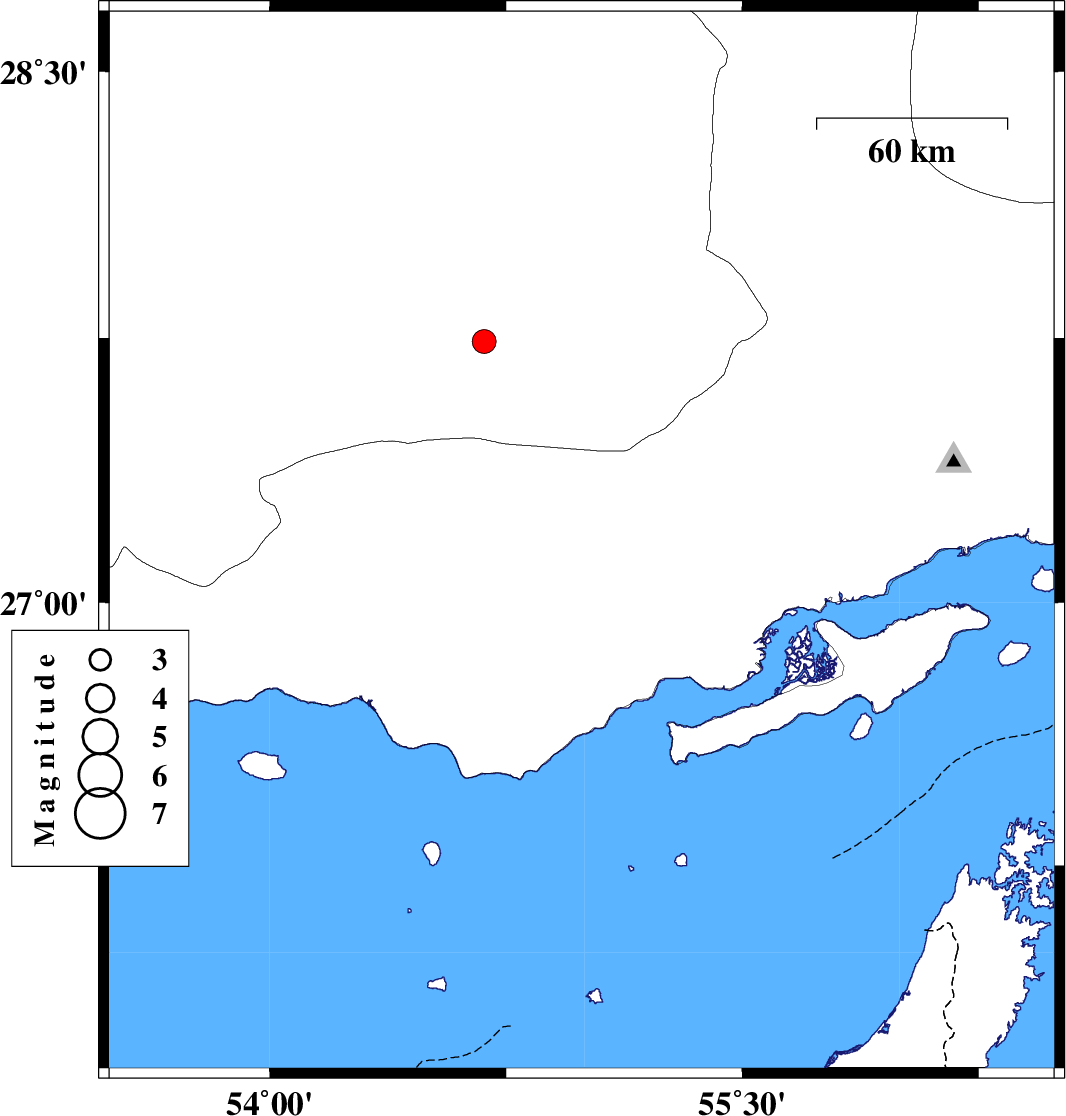 | 2011/08/27 | 15:02:06.2 | 19:32:06.2 | 28.23 | 55.86 | 6 | ML3.4 | Hormozgan Province, 10 km Hajiabad |