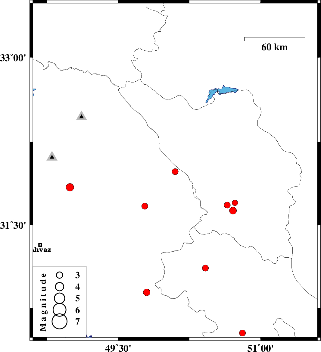 | 2011/08/06 | 05:19:41.7 | 09:49:41.7 | 31.84 | 48.99 | 14 | ML3.7 | Khoozestan Province, 26 km South-East of Shushtar |