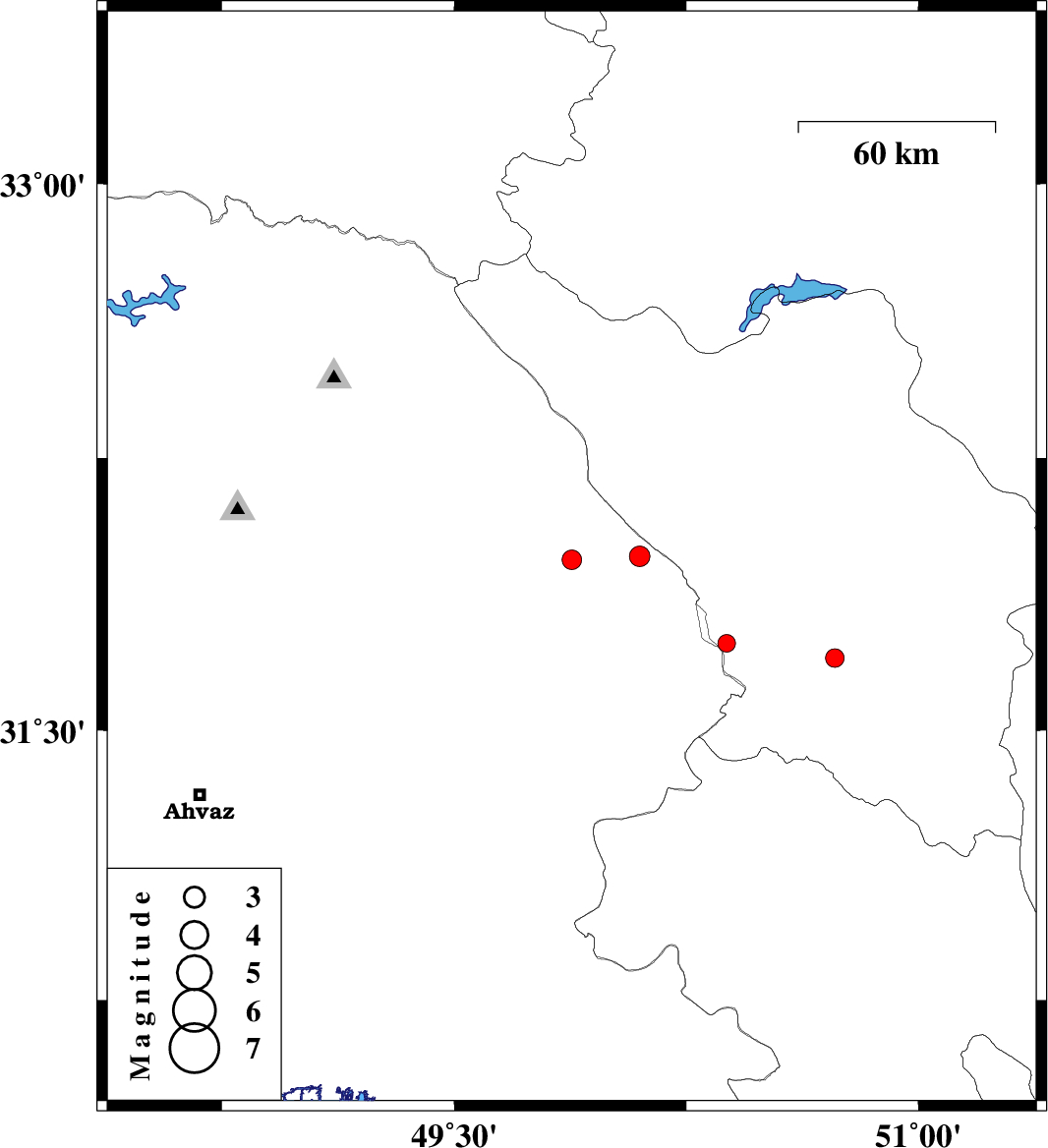 | 2011/09/04 | 18:26:26.8 | 22:56:26.8 | 31.98 | 50.1 | 14 | ML2.9 | Khoozestan Province, 27 km North-East of Izeh | ||
