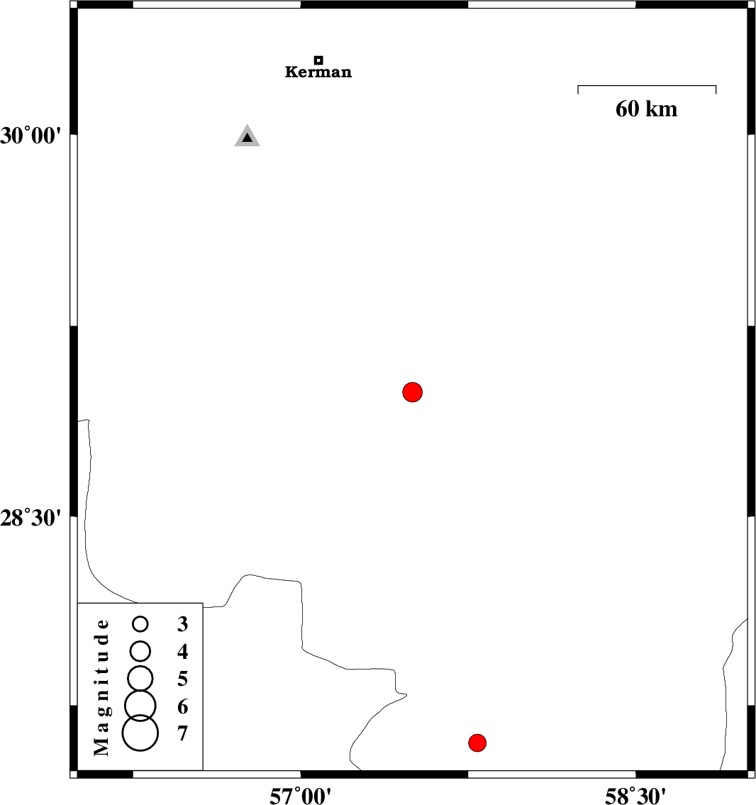 | 2011/09/13 | 05:05:08.6 | 09:35:08.6 | 27.6 | 57.79 | 40 | ML3.5 | Kerman Province, 41 km South of Kahnuj |