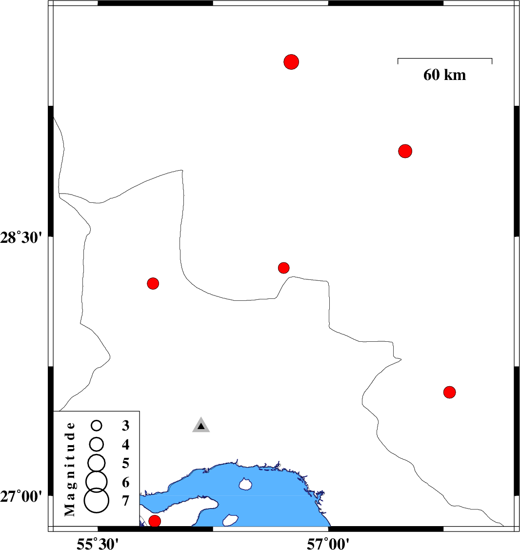 | 2011/08/27 | 15:02:06.2 | 19:32:06.2 | 28.23 | 55.86 | 6 | ML3.4 | Hormozgan Province, 10 km Hajiabad |
