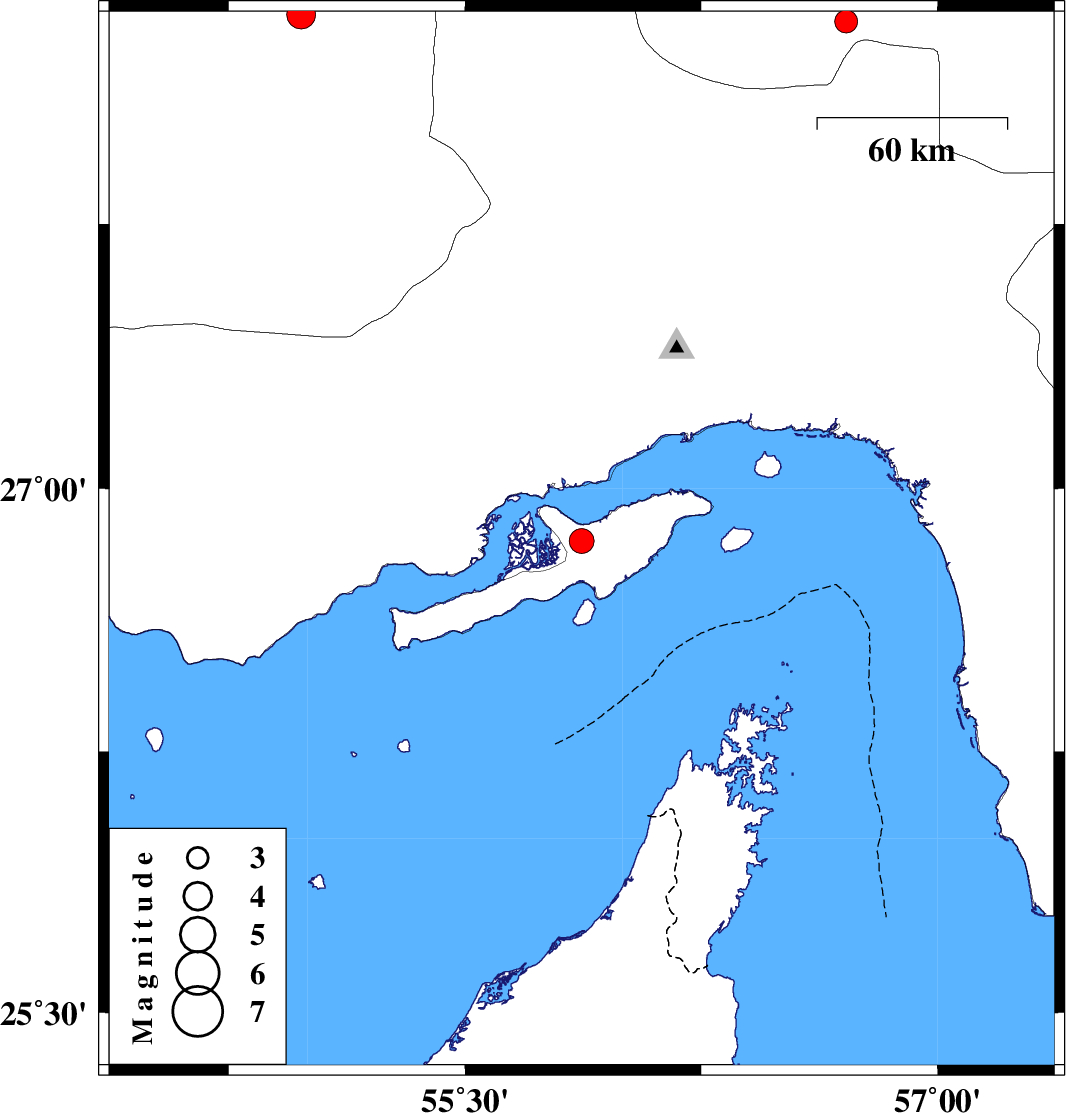 | 2011/09/23 | 22:12:37.4 | 01:42:37.4 | 26.85 | 55.87 | 18 | ML3.5 | Persian Gulf, 41 km South-West of Qeshm | ||