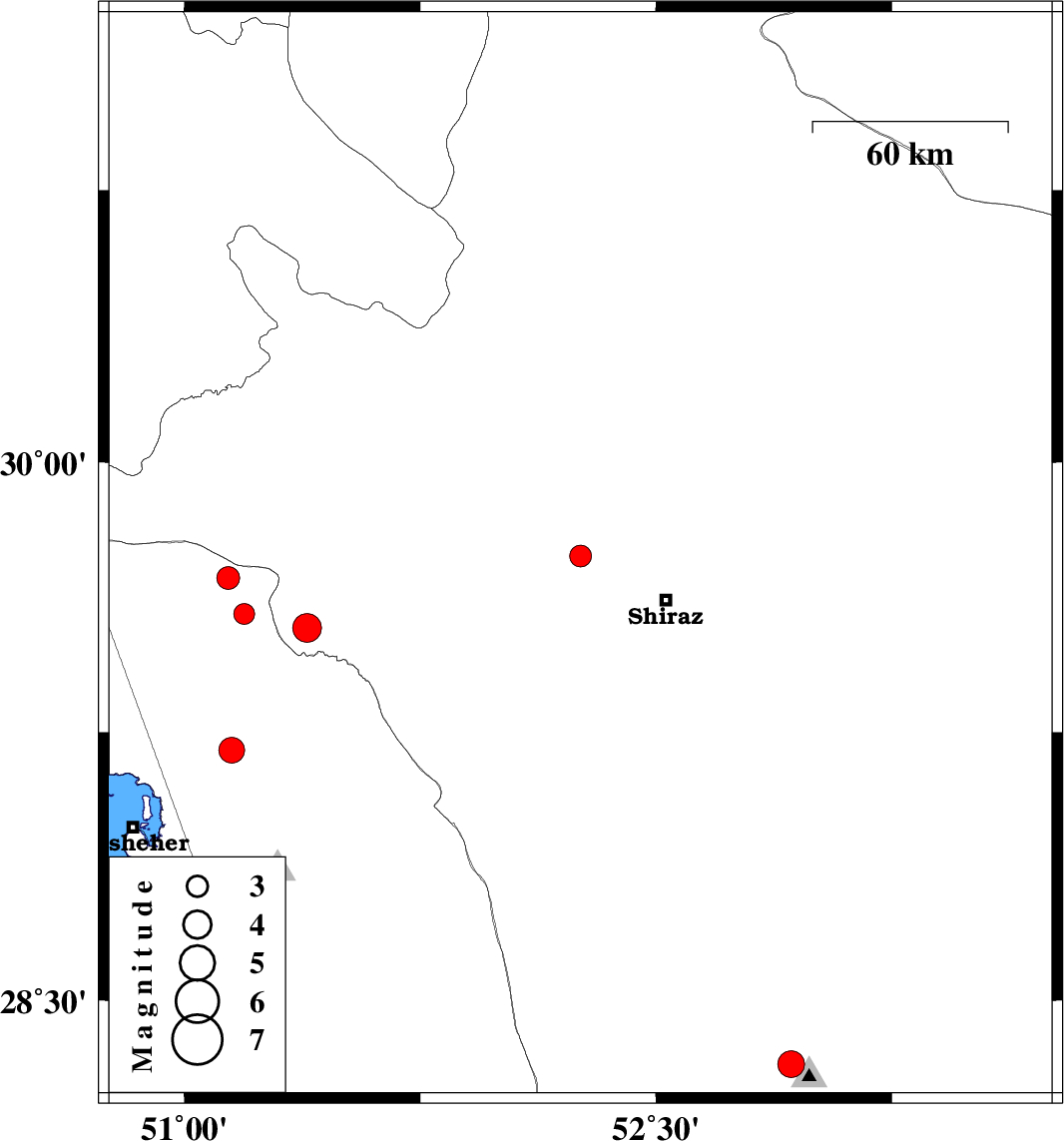 | 2011/08/27 | 01:49:19.7 | 06:19:19.7 | 29.58 | 51.19 | 14 | ML2.9 | Bushehr Province, 35 km North of Borazjan |