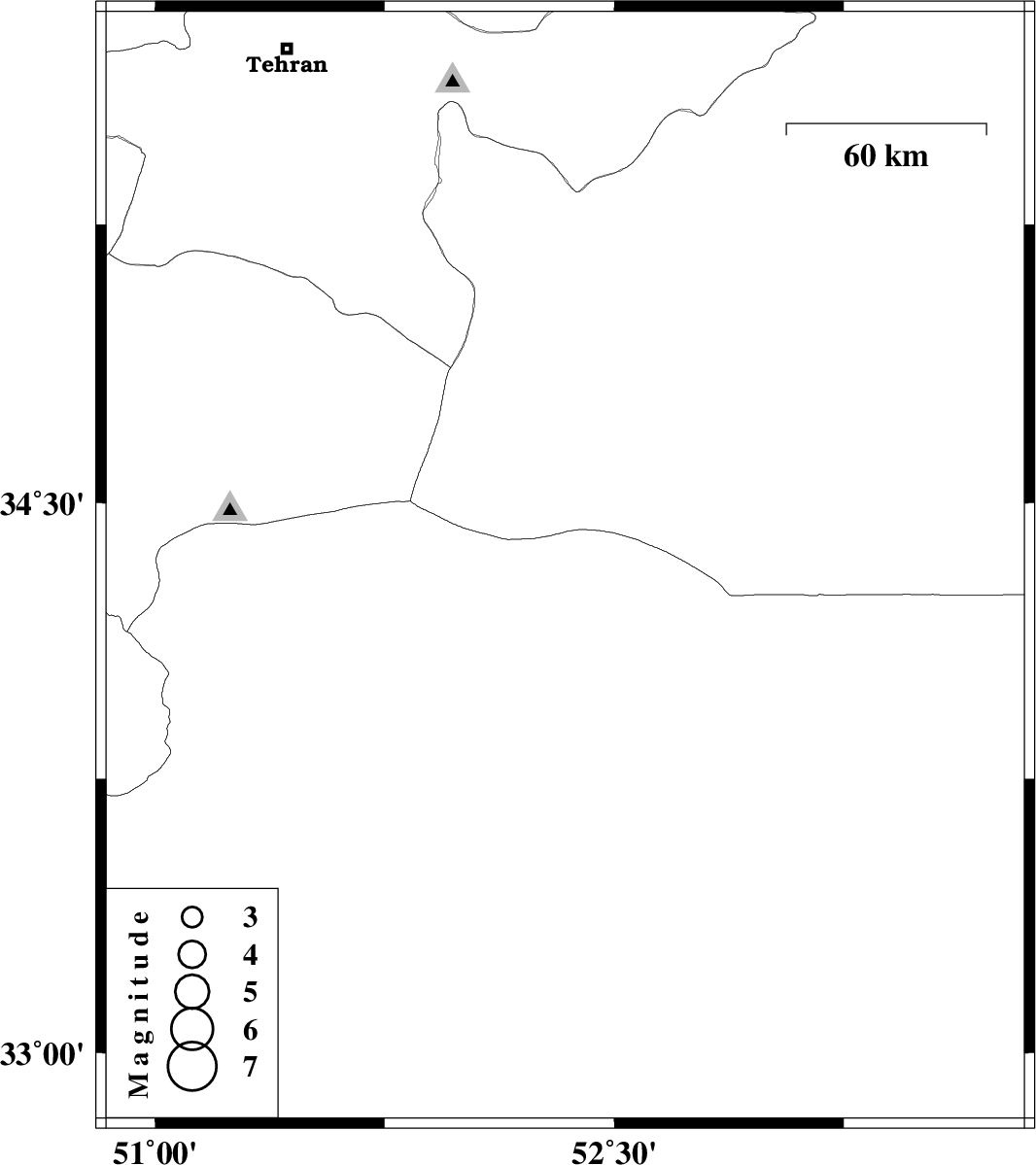 | 2011/09/30 | 03:29:57.8 | 06:59:57.8 | 34.32 | 52.34 | 14 | ML2.5 | Esfahan Province, 100 km South of Garmsar |