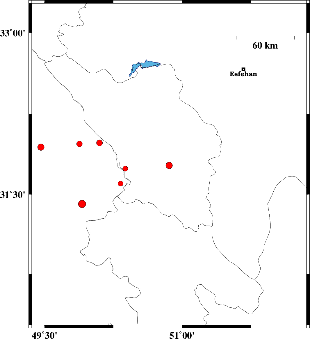 | 2011/10/02 | 01:28:32.9 | 04:58:32.9 | 31.77 | 50.86 | 14 | ML3.3 | Chaharmahal Bakhtiari Province, 30 km North of Lordegan | ||
