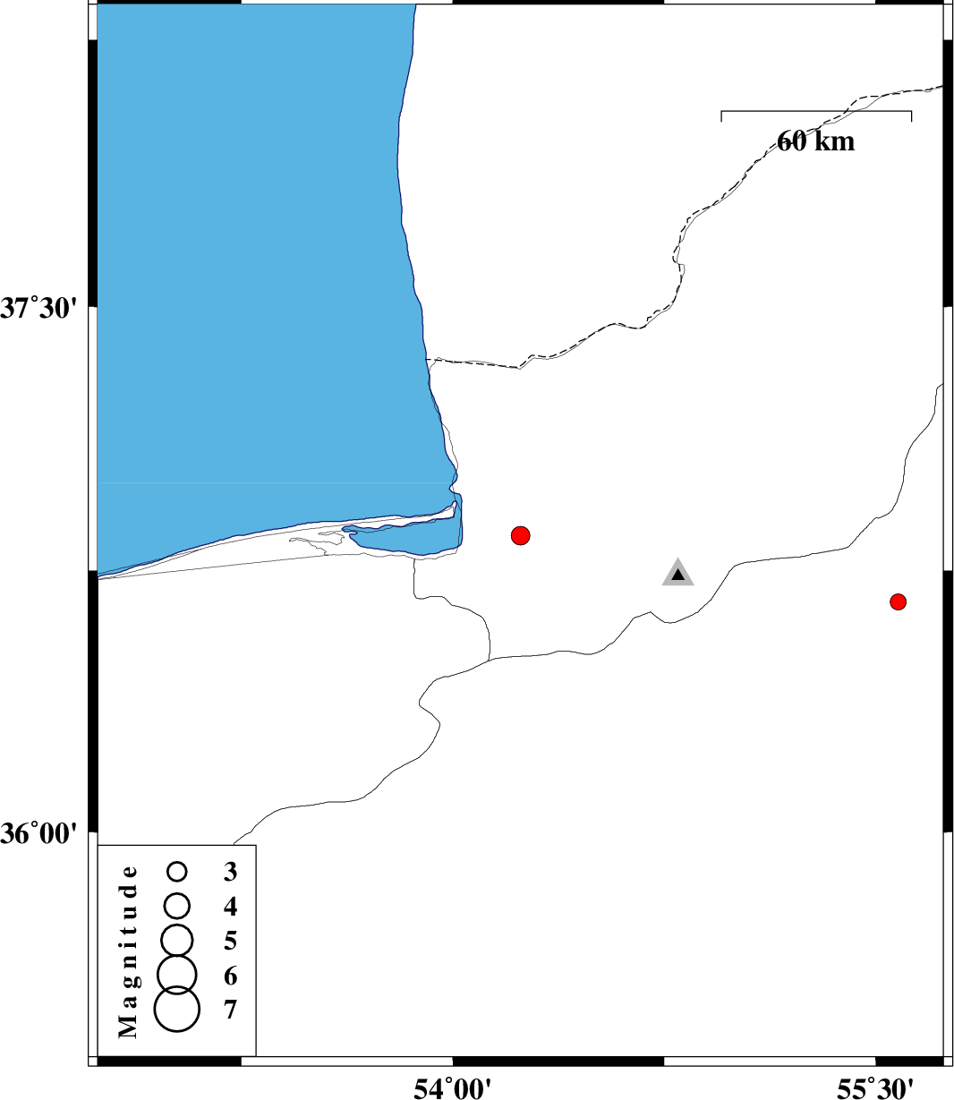 | 2011/10/02 | 02:06:45.5 | 05:36:45.5 | 36.85 | 54.24 | 15 | ML2.9 | Golestan Province, 13 km East of Kordkuy | ||