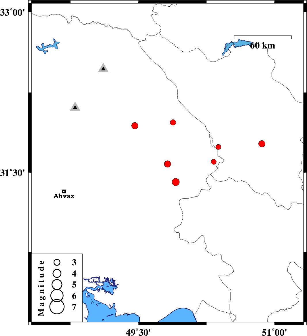 | 2011/09/14 | 15:29:55.4 | 19:59:55.4 | 31.41 | 49.91 | 18 | ML3.7 | Khoozestan Province, 12 km South of Bagh Malek | ||