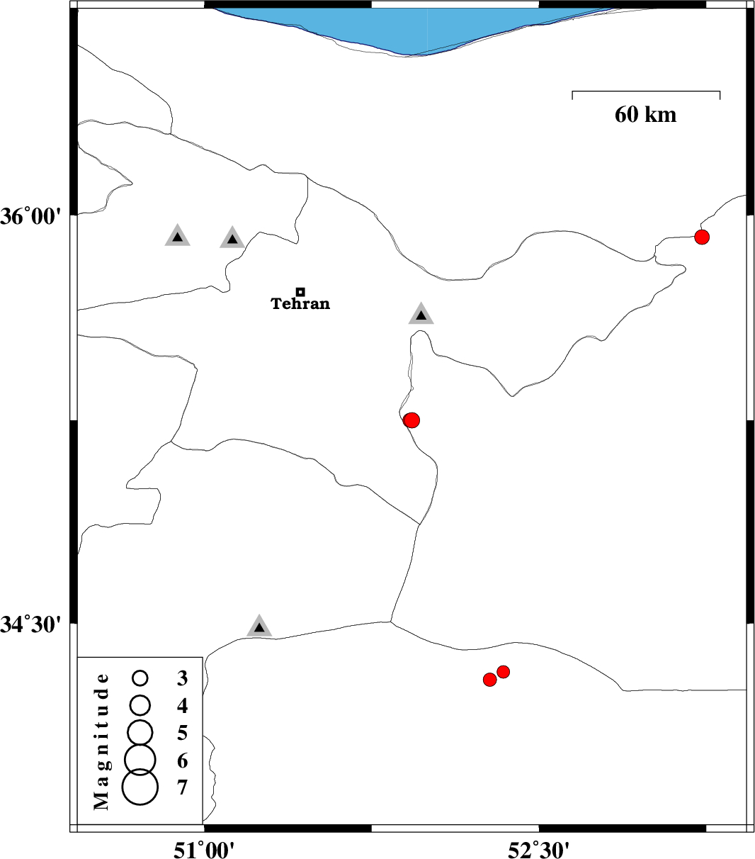 | 2011/10/07 | 00:39:11.2 | 04:09:11.2 | 35.25 | 51.93 | 15 | ML3.1 | Semnan Province, 25 km East of Varamin | ||