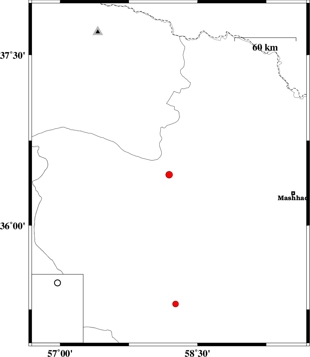 | 2011/10/18 | 20:08:47.5 | 23:38:47.5 | 36.45 | 58.19 | 19 | ML3.4 | Khorasan(center) Province, 53 km North-East of Sabzevar | ||