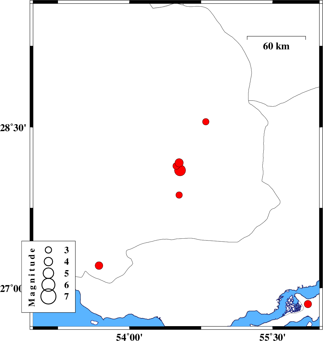 | 2011/09/20 | 20:23:42.3 | 00:53:42.3 | 27.21 | 53.68 | 29 | ML3.6 | Fars Province, 53 km South-East of Lamerd |