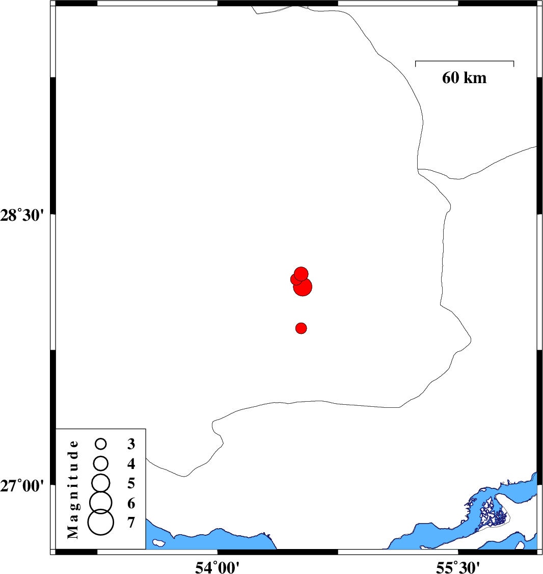 2011/10/19 03:10:20.0 06:40:20.0 28.1754.5214 ML3.9 Fars Province, 64 km South of Darab