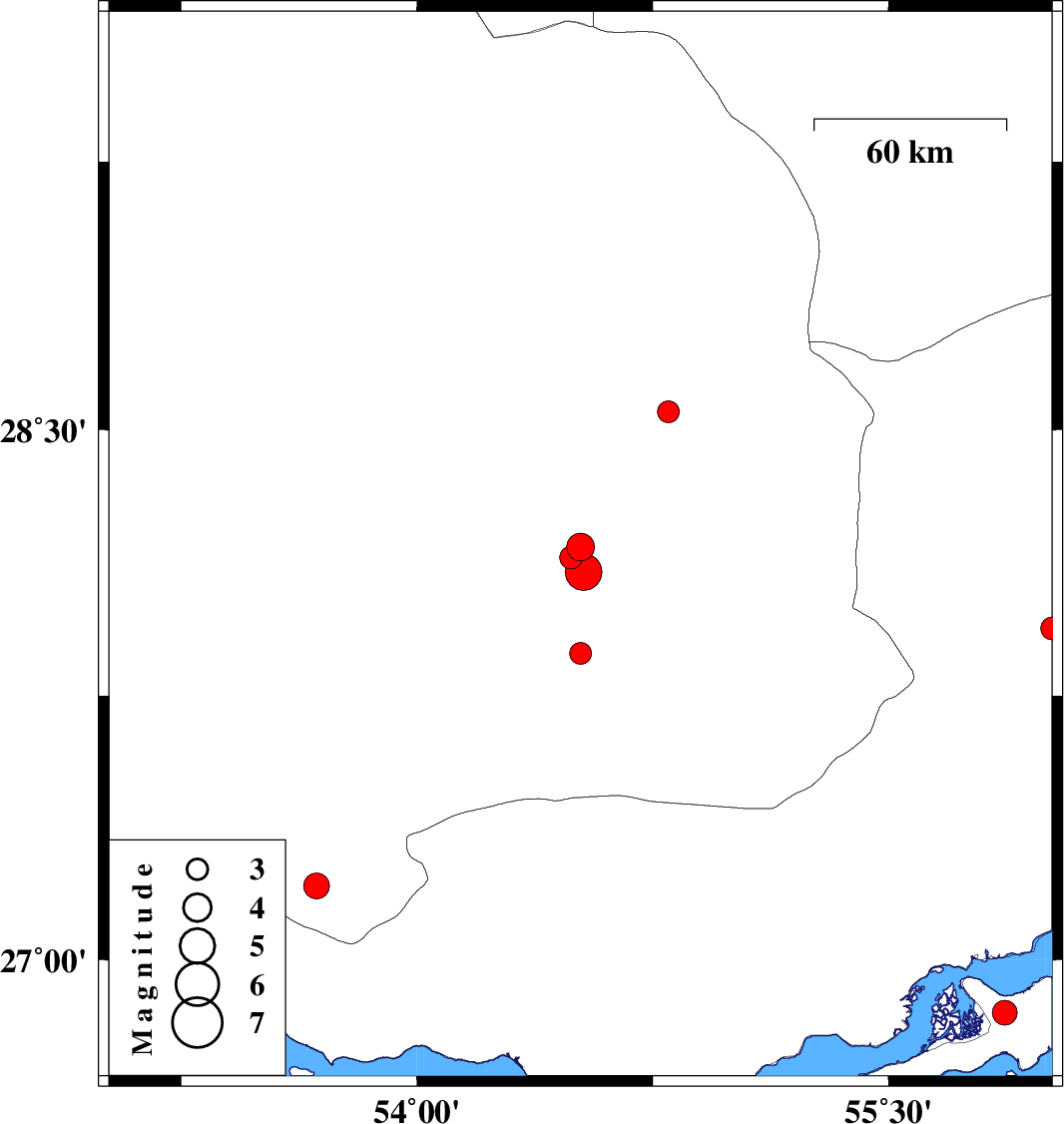 2011/10/19 03:10:20.0 06:40:20.0 28.1754.5214 ML3.9 Fars Province, 64 km South of Darab