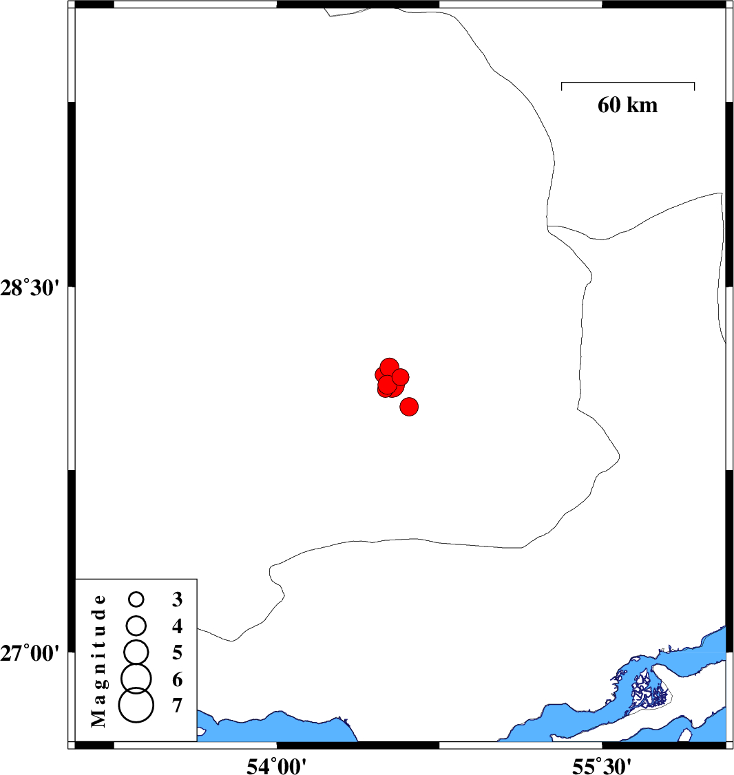 2011/10/19 03:10:20.0 06:40:20.0 28.1754.5214 ML3.9 Fars Province, 64 km South of Darab