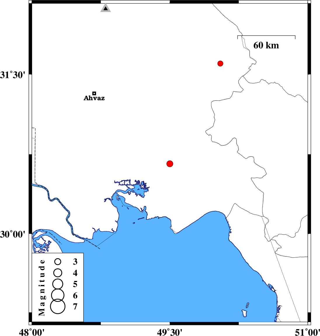 | 2011/10/22 | 11:33:52.2 | 15:03:52.2 | 31.6 | 50.05 | 14 | ML2.7 | Khoozestan Province, 17 km East of Bagh Malek |
