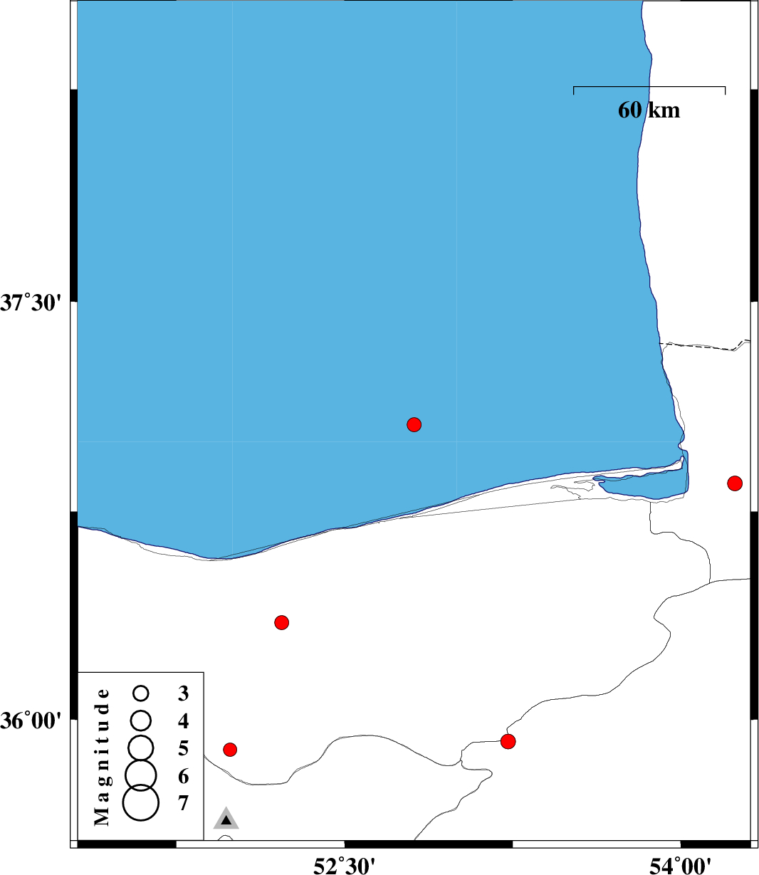 | 2011/10/26 | 17:09:54.6 | 20:39:54.6 | 37.06 | 52.81 | 17 | ML2.8 | Caspian Sea, 43 km North-East of Babolsar | ||