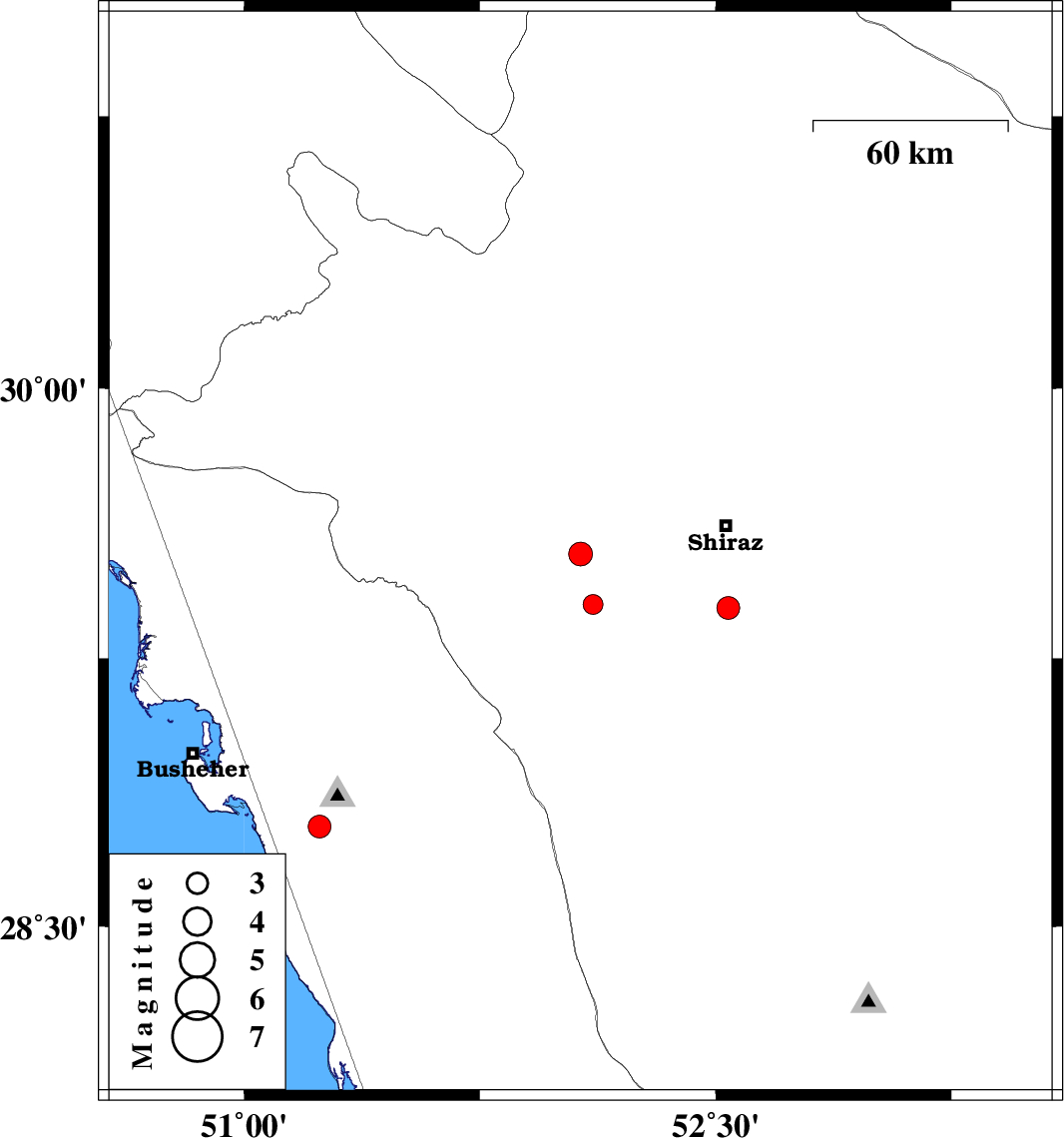 | 2011/10/09 | 12:05:13.2 | 15:35:13.2 | 29.39 | 52.54 | 42 | ML3.2 | Fars Province, 26 km South of Shiraz | ||