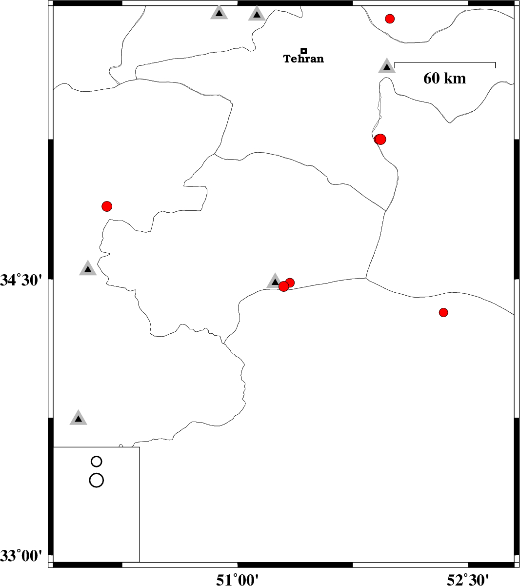 | 2011/10/07 | 00:39:11.2 | 04:09:11.2 | 35.25 | 51.93 | 15 | ML3.1 | Semnan Province, 25 km East of Varamin | ||