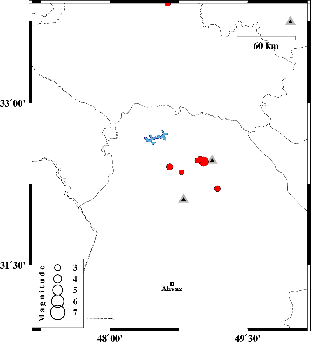 | 2011/10/30 | 01:12:06.8 | 04:42:06.8 | 32.48 | 48.98 | 15 | ML2.9 | Khoozestan Province, 16 km West of Lali | ||