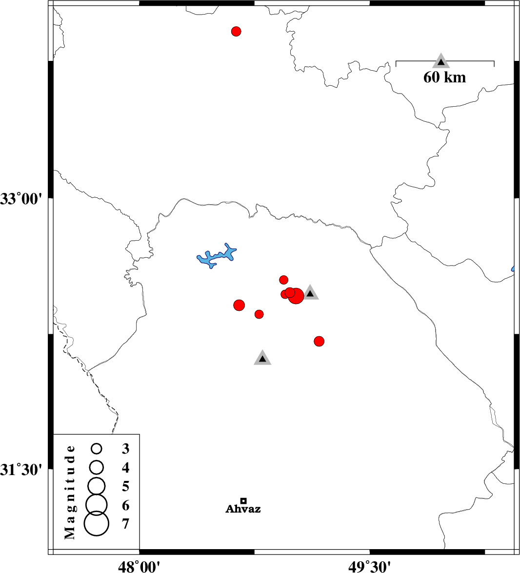 | 2011/10/30 | 01:12:06.8 | 04:42:06.8 | 32.48 | 48.98 | 15 | ML2.9 | Khoozestan Province, 16 km West of Lali | ||