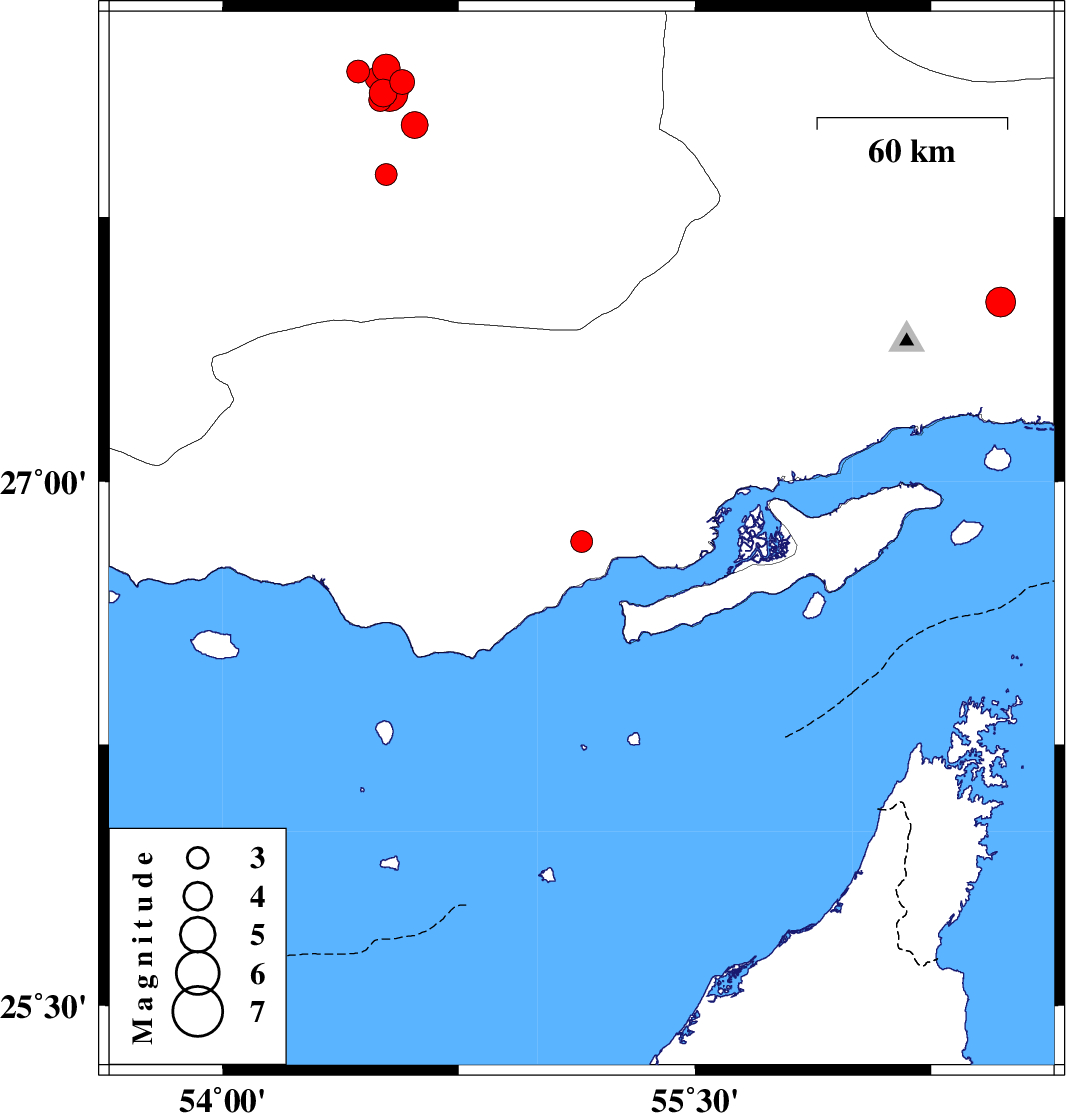 | 2011/11/05 | 07:45:44.5 | 11:15:44.5 | 26.83 | 55.14 | 40 | ML3.1 | Hormozgan Province, 44 km North-East of Bandar-e lengeh | ||