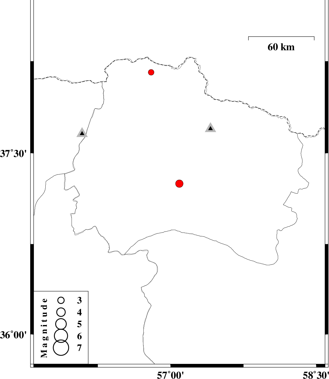 | 2011/11/02 | 00:05:33.3 | 03:35:33.3 | 38.16 | 56.8 | 29 | ML2.7 | Khorasan(north) Province, 69 km North-West of Ashkhaneh |