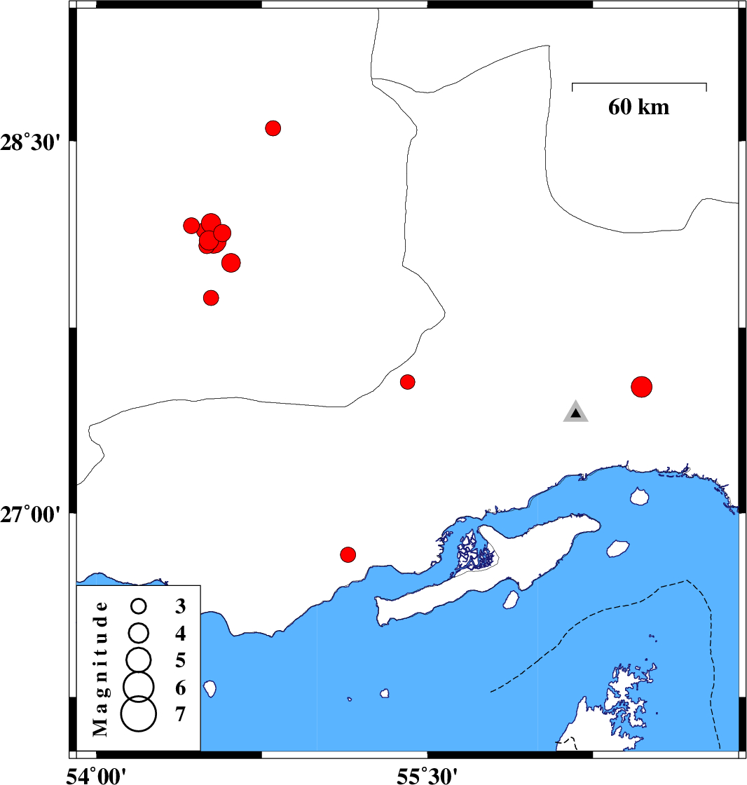 | 2011/10/12 | 20:05:02.3 | 23:35:02.3 | 27.87 | 54.52 | 15 | ML3.1 | Fars Province, 28 km North-East of Lar | ||