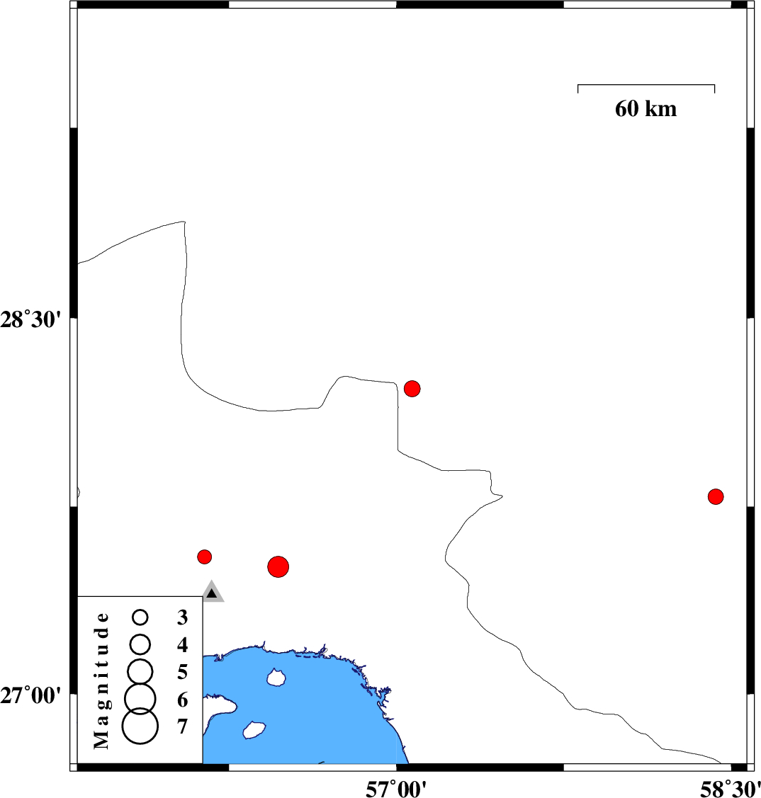 | 2011/11/12 | 13:07:05.2 | 16:37:05.2 | 28.22 | 57.07 | 14 | ML3.2 | Kerman Province, 68 km North-West of Kahnuj | ||