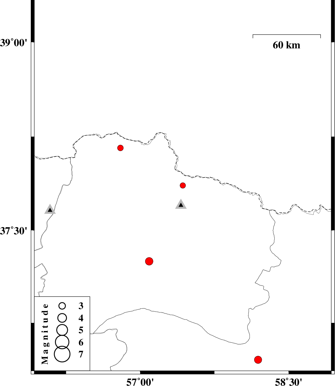 | 2011/11/13 | 18:36:52.4 | 22:06:52.4 | 37.86 | 57.43 | 3 | ML2.5 | Khorasan(north) Province, 44 km North of Bojnurd | ||