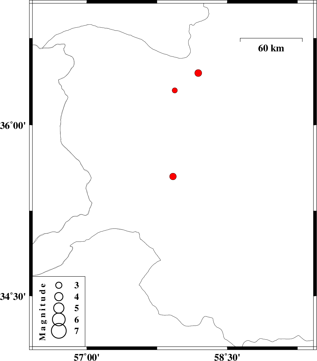 | 2011/11/14 | 06:54:37.0 | 10:24:37.0 | 35.55 | 57.92 | 43 | ML3.3 | Khorasan(center) Province, 32 km North of Bardeskan | ||