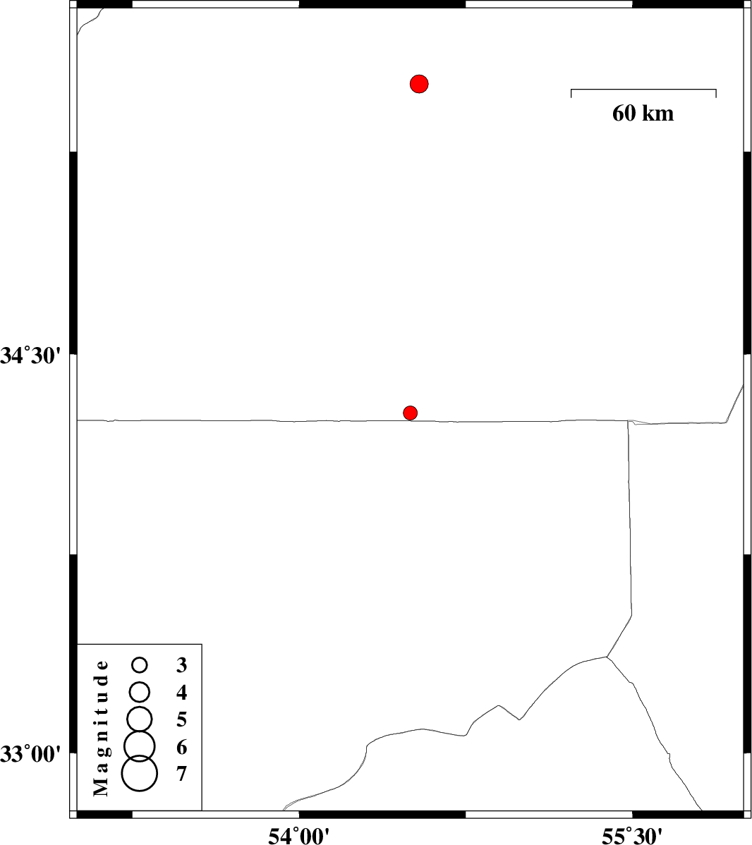 | 2011/10/17 | 00:02:44.6 | 03:32:44.6 | 35.5 | 54.54 | 18 | ML3.7 | Semnan Province, 75 km South-East of Damghan |