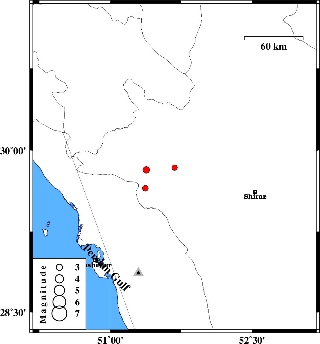 | 2011/11/17 | 19:40:57.7 | 23:10:57.7 | 29.82 | 51.38 | 41 | ML3.3 | Fars Province, 36 km South-West of Nurabad | ||