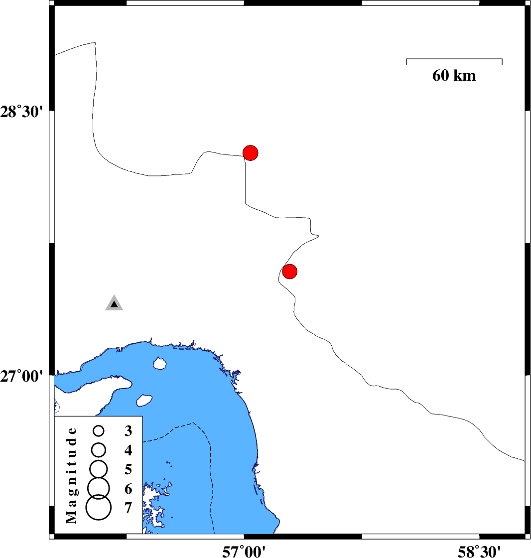 | 2011/11/13 | 14:11:06.8 | 17:41:06.8 | 28.26 | 57.04 | 14 | ML4.4 | Kerman Province, 73 km North-West of Kahnuj |