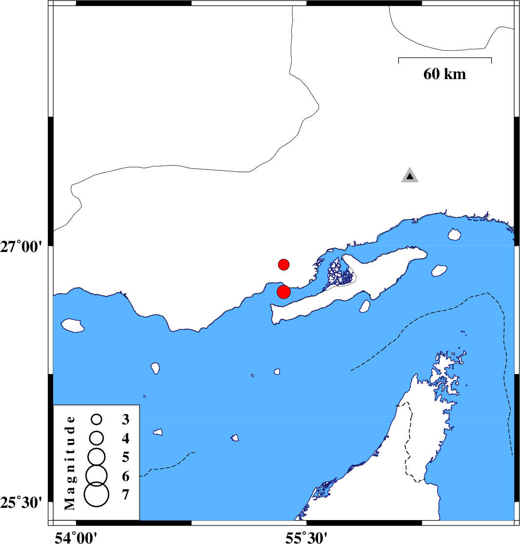 | 2011/11/20 | 07:20:16.6 | 10:50:16.6 | 26.73 | 55.35 | 39 | ML4 | Persian Gulf, 55 km North-East of Bandar-e lengeh | ||