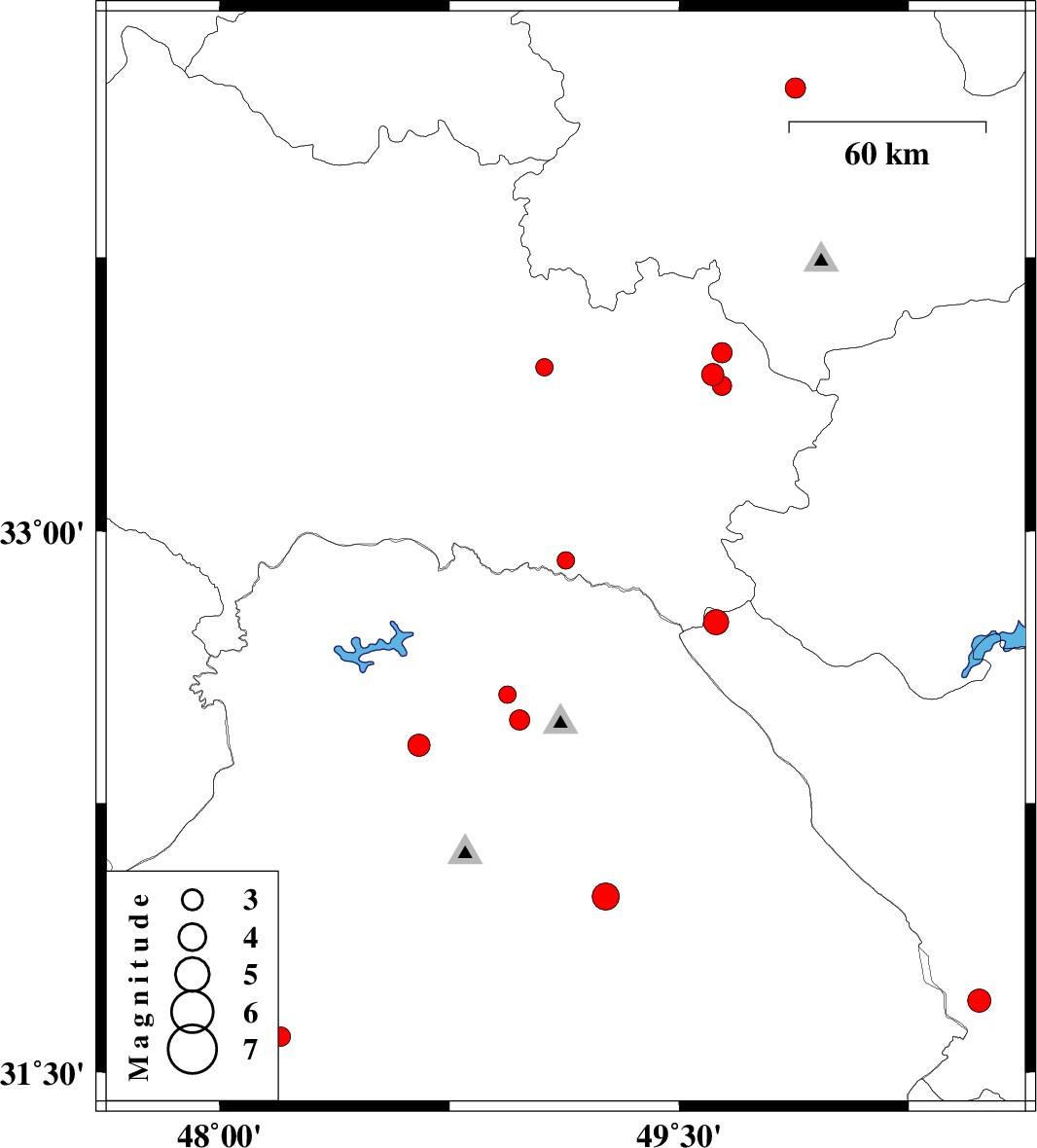 | 2011/10/30 | 01:12:06.8 | 04:42:06.8 | 32.48 | 48.98 | 15 | ML2.9 | Khoozestan Province, 16 km West of Lali |