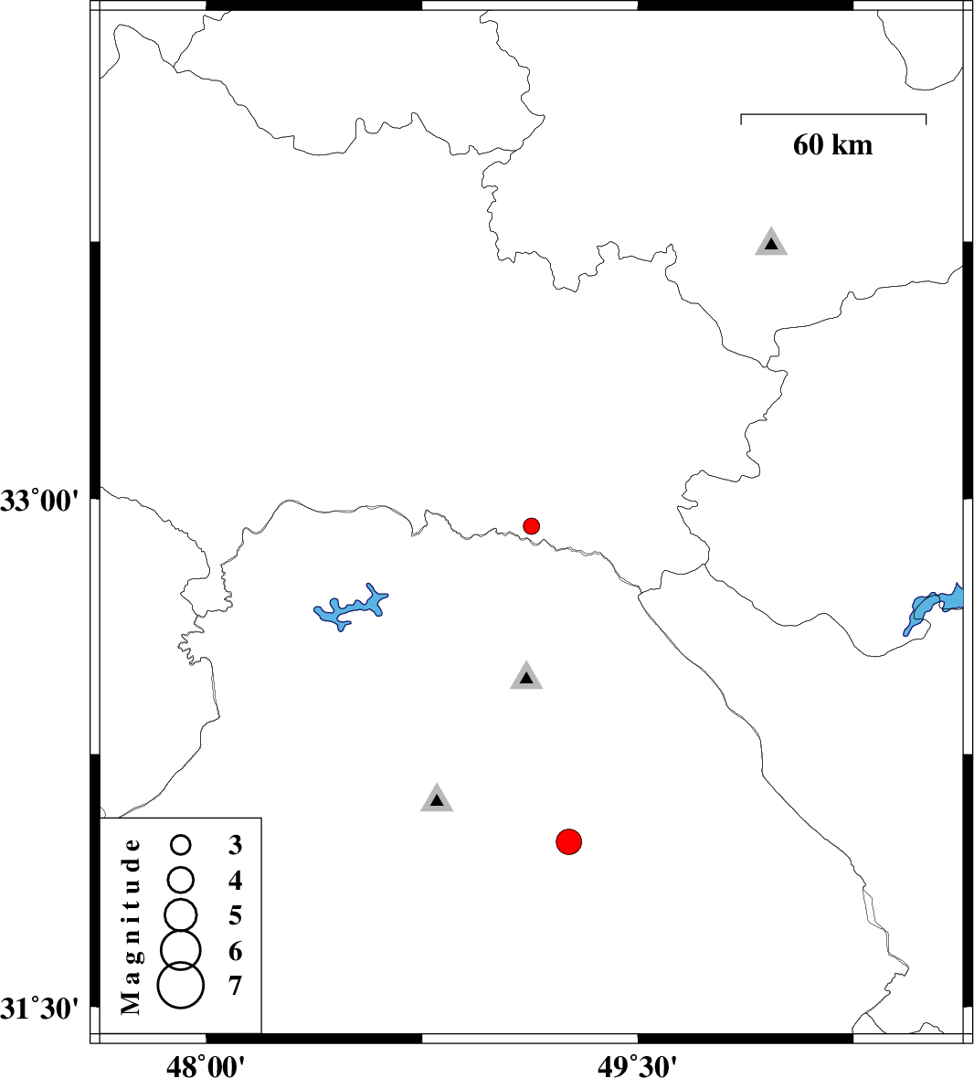 | 2011/11/24 | 14:10:30.2 | 17:40:30.2 | 31.99 | 49.26 | 14 | ML3.9 | Khoozestan Province, 7 km Masjed Soleyman |
