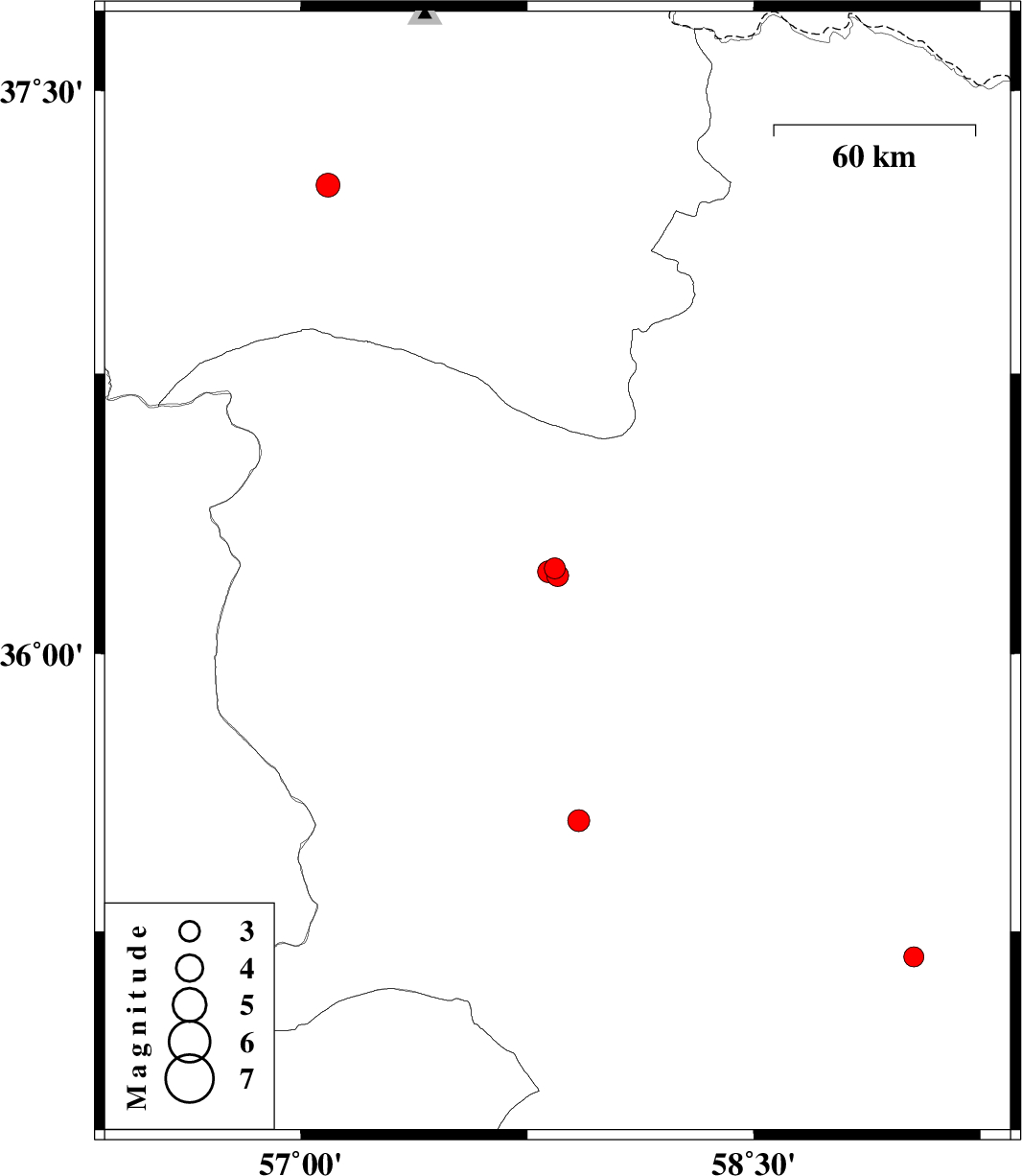 | 2011/11/07 | 05:50:45.3 | 09:20:45.3 | 37.25 | 57.09 | 14 | ML3.5 | Khorasan(north) Province, 36 km South-East of Ashkhaneh |