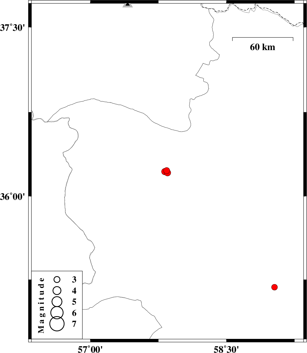 | 2011/11/30 | 23:53:25.4 | 03:23:25.4 | 36.23 | 57.84 | 14 | ML3.1 | Khorasan(center) Province, 15 km East of Sabzevar | ||