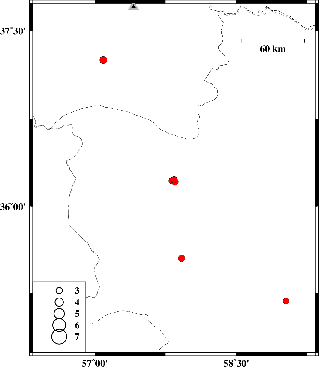 | 2011/11/14 | 06:54:37.0 | 10:24:37.0 | 35.55 | 57.92 | 43 | ML3.3 | Khorasan(center) Province, 32 km North of Bardeskan | ||