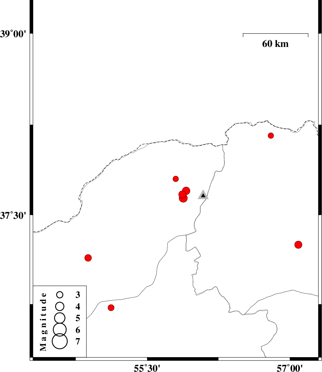 | 2011/11/26 | 12:04:55.2 | 15:34:55.2 | 37.14 | 54.88 | 27 | ML3.2 | Golestan Province, 26 km North of Ali Abad | ||