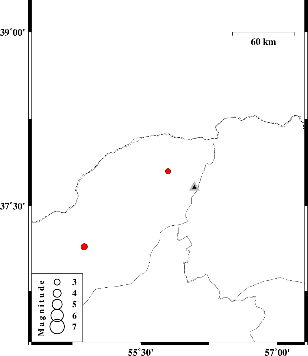| 2011/12/01 | 03:56:42.1 | 07:26:42.1 | 37.8 | 55.8 | 6 | ML2.7 | Golestan Province, 54 km North-East of Kalaleh | ||