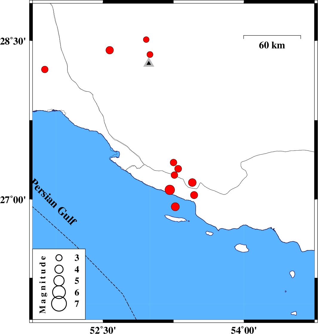 | 2011/12/09 | 08:46:32.1 | 12:16:32.1 | 26.93 | 53.27 | 16 | ML3.9 | Persian Gulf, 46 km South-East of Lamerd | ||