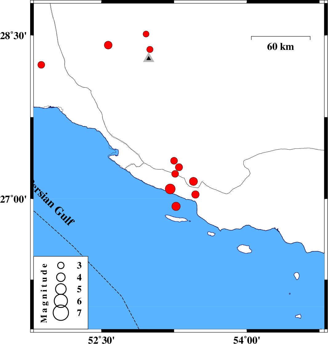 | 2011/12/09 | 08:46:32.1 | 12:16:32.1 | 26.93 | 53.27 | 16 | ML3.9 | Persian Gulf, 46 km South-East of Lamerd | ||