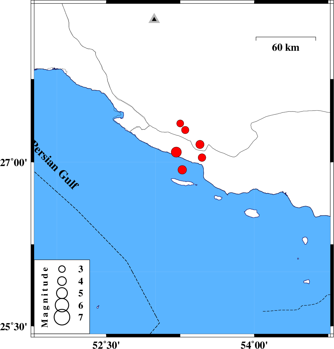 | 2011/12/09 | 08:46:32.1 | 12:16:32.1 | 26.93 | 53.27 | 16 | ML3.9 | Persian Gulf, 46 km South-East of Lamerd | ||